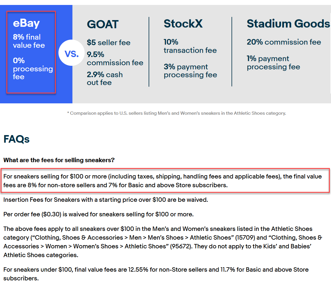 - For sneakers selling for $100 or more (including taxes, shipping, handling fees and applicable fees), the new final value fees are 8% for non-store sellers and 7% for Basic and above Store subscribers.