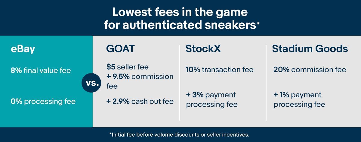- eBay continues to remain the most cost-competitive online marketplace for sneaker resale among competitors like GOAT, StockX, and Stadium Goods. From no-fee verified returns and seller protections through Authenticity Guarantee, to tools and resources to build and boost your business, to the highest sales velocity of any marketplace, eBay equips sellers like no other to accelerate and scale their businesses.