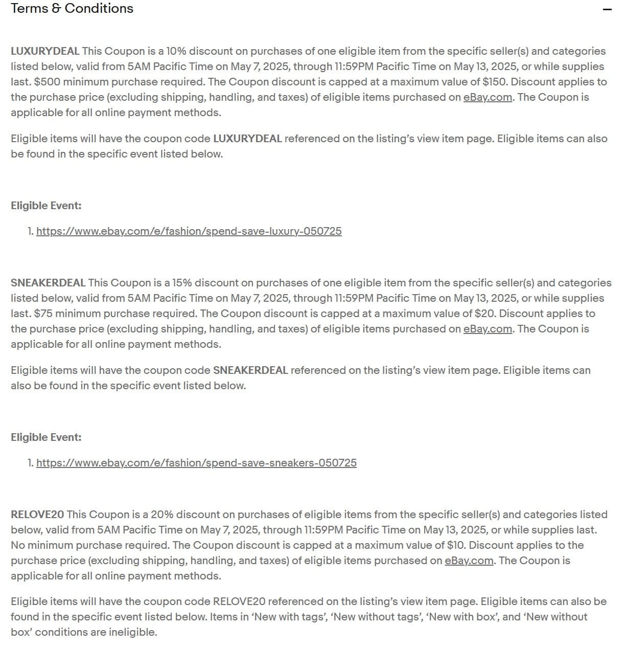 The eBay-funded fashion-themed sale event offered multiple discount opportunities with LUXURYDEAL offering 10% off select luxury accessories, SNEAKERDEAL for 15% off select sneakers, and RELOVE20 for 20% off pre-loved fashion - all with an advertised expiration of 11:59PM Pacific Time on May 13, 2025, or while supplies last.
