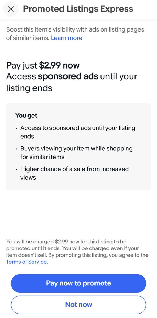 Instead of the cost per sale model that sellers were used to with Promoted Listings Standard ads, PL Express for auctions charged a flat rate upfront fee simply to have your ad displayed to potential buyers, regardless of whether or not the item sold.