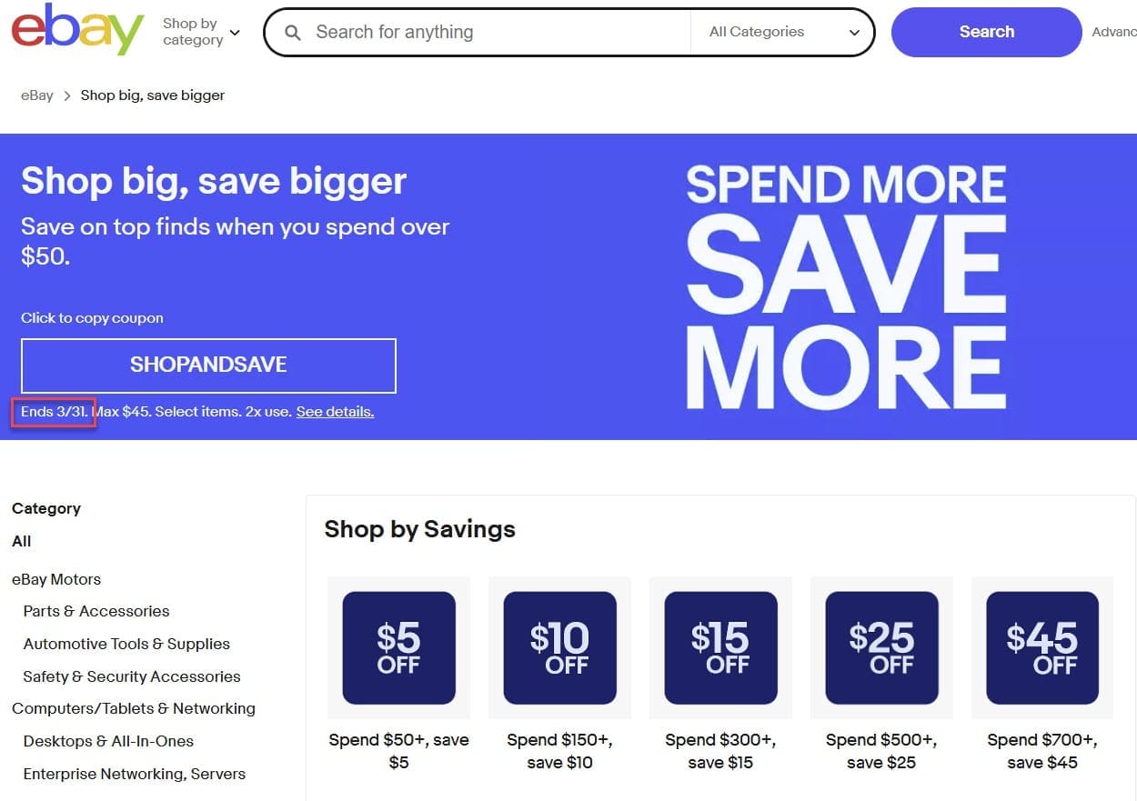 While the offer was supposed to be good through midnight on March 31, buyers in the eBay community forum report the SHOPANDSAVE code stopped working days before the deadline, leaving questions about whether eBay intentionally ended the offer early or if there is a technical issue preventing use of the coupon.