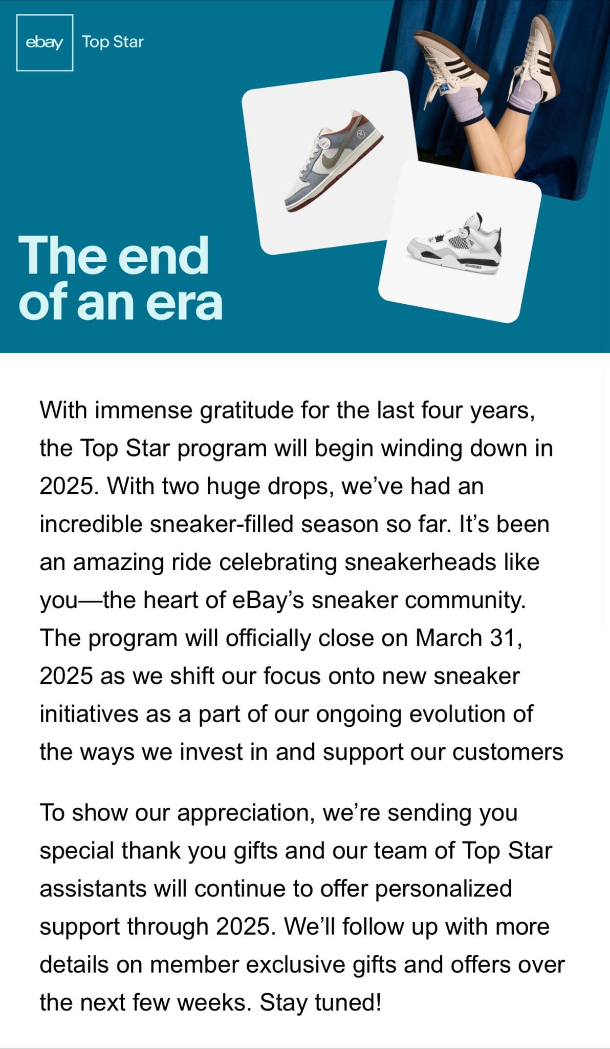 eBay is quietly ending their Top Star buyer loyalty program for sneakers amidst broader strategy shift away from focus verticals and back to core consumer to consumer market.