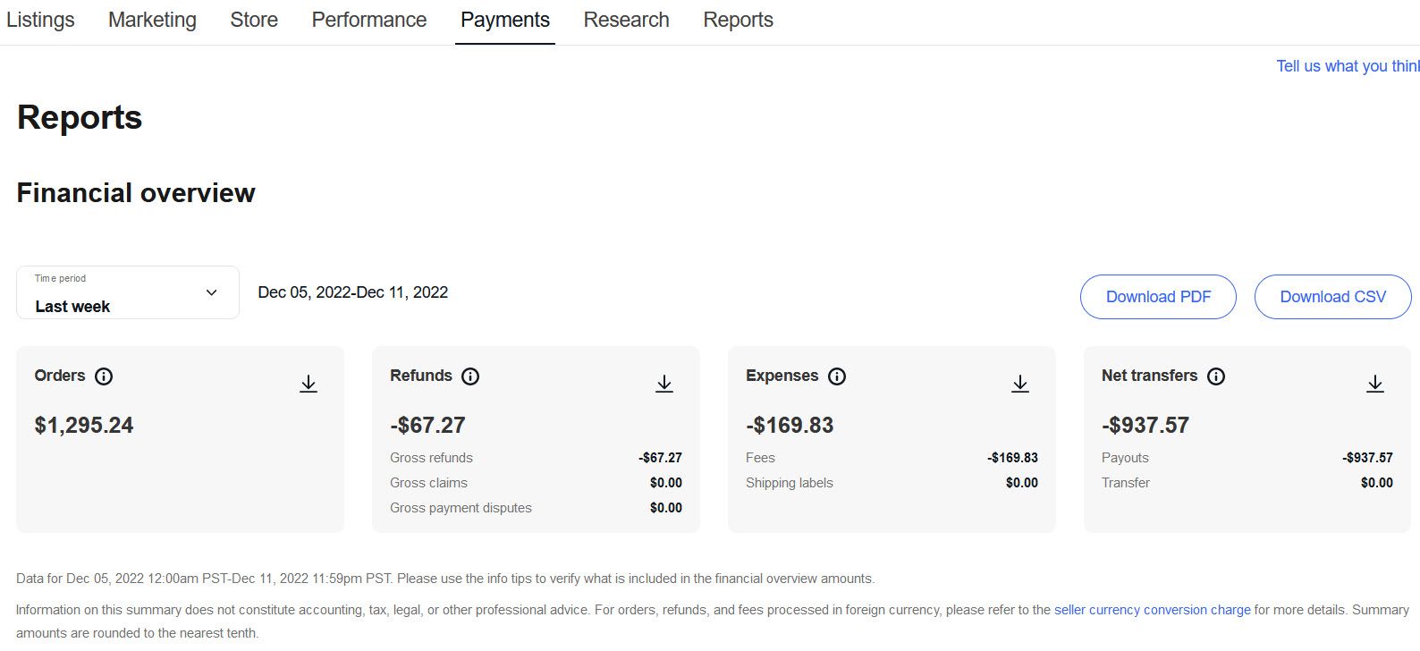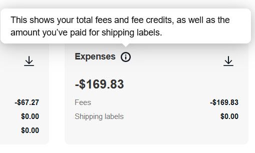 Expenses: This shows your total fees and fee credits, as well as the amount you’ve paid for shipping labels.