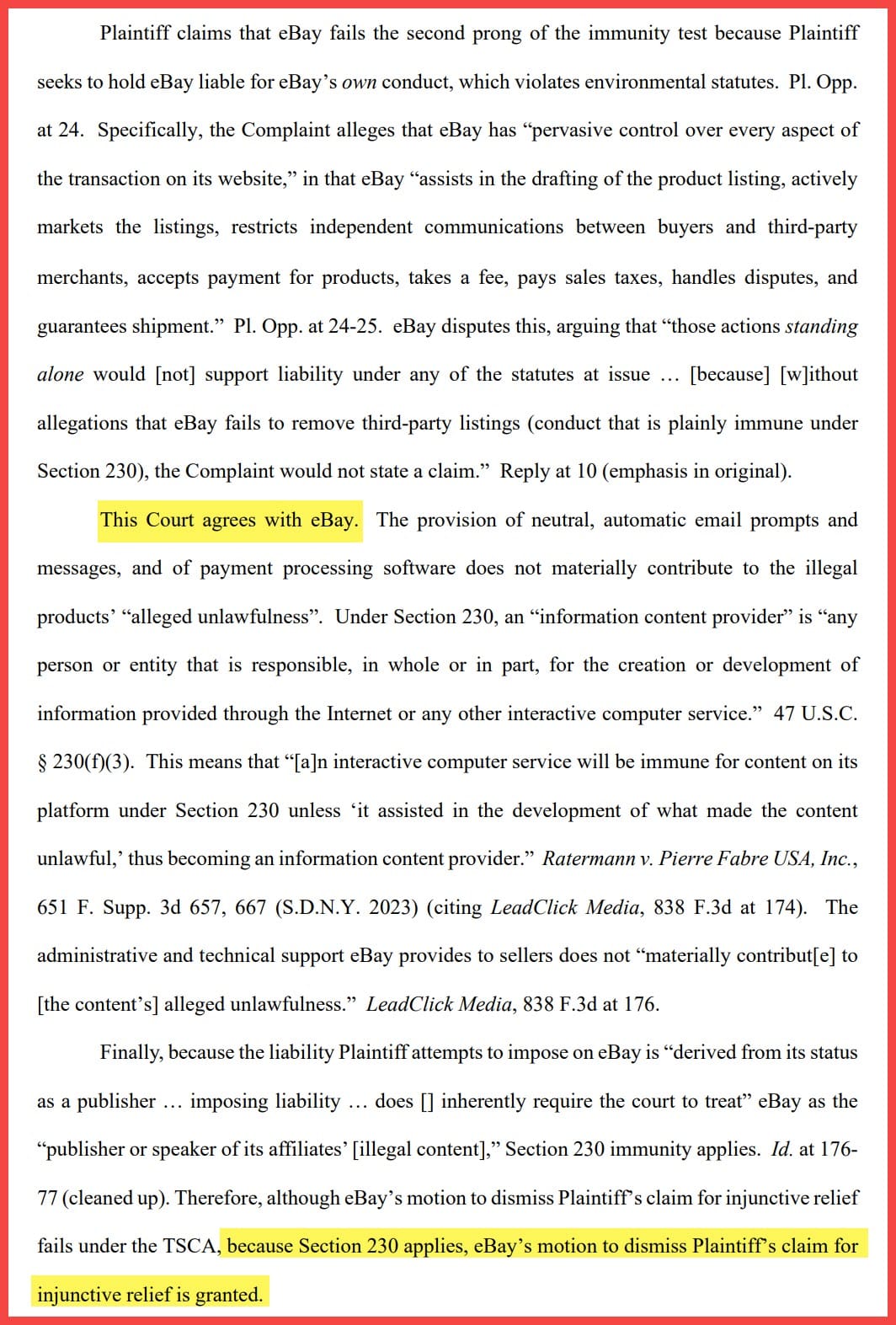 But eBay brought in some heavy-hitters, hiring law firms with notable history in defense against environmental claims (including representing Volkswagen and Fiat Chrysler through their respective diesel emissions scandals as well as BP during the Deepwater Horizon oil spill) and a strategy that focused heavily on arguing Section 230 of the Communications Decency Act protects eBay from liability for items sold by 3rd parties on their site.