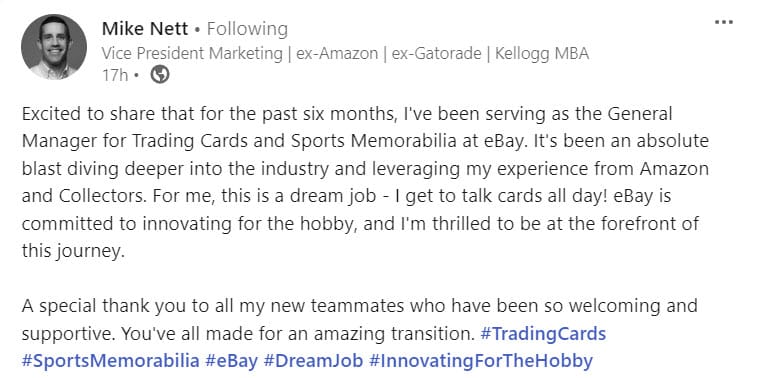 Excited to share that for the past six months, I've been serving as the General Manager for Trading Cards and Sports Memorabilia at eBay.