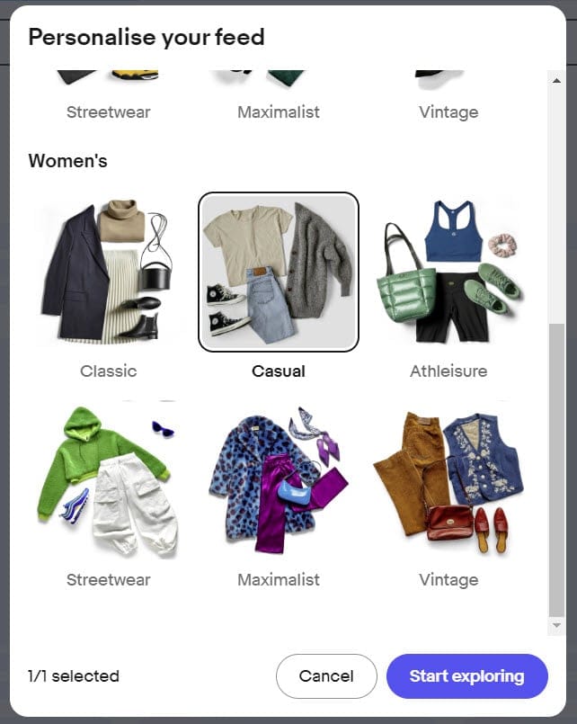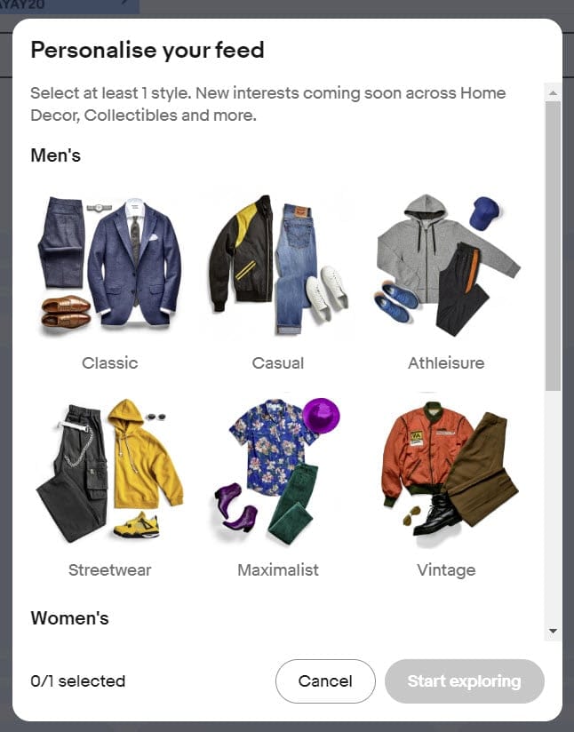 Clicking the link engages a pop up where you can choose an interest to personalize your feed - for now only clothing categories are available, but eBay says new interests across Home Decor, Collectibles and more are coming soon.