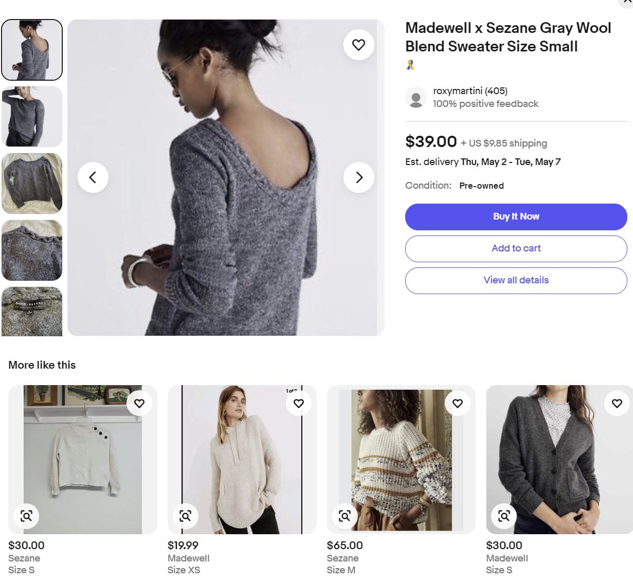 All of the thumbnails displayed in eBay Explore also have the "search visually similar" icon in the lower left corner, and clicking that icon will display more results that also do not show any titles or seller details.
