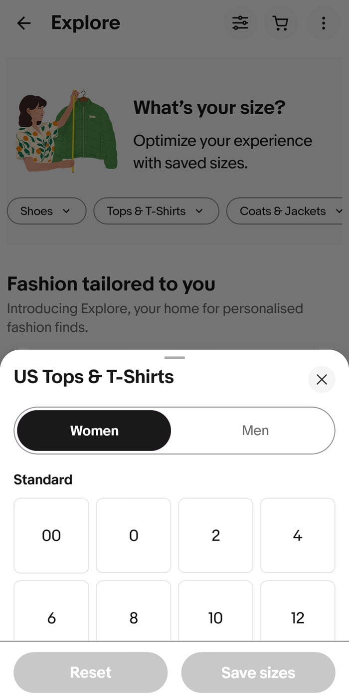 The feature now includes options to set preferred sizes for shoes, tops and shirts, coats and jackets, dresses and skirts, and pants and jeans.