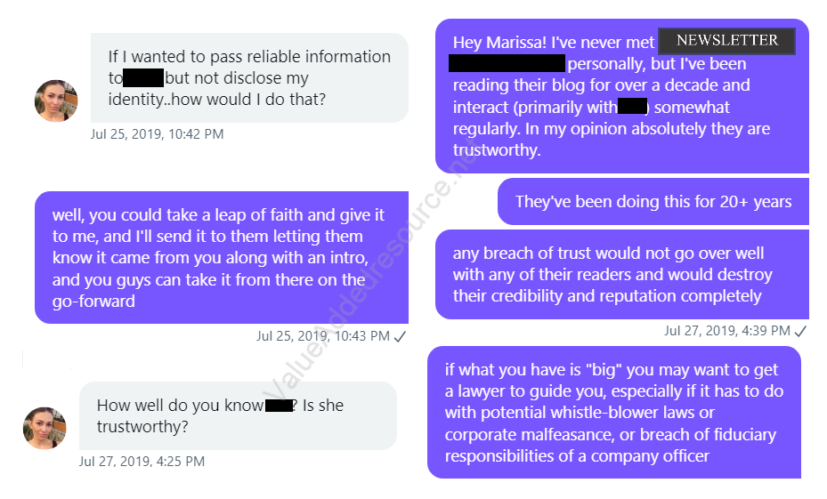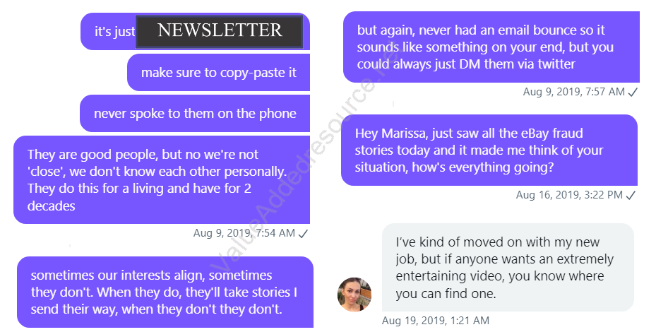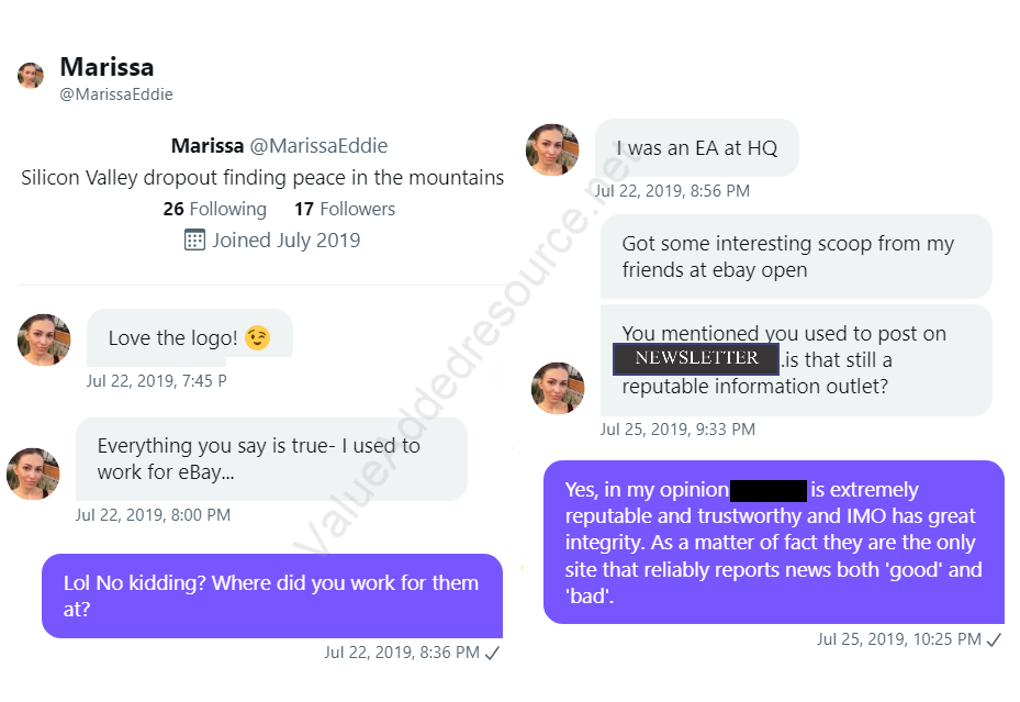 That fake disgruntled employee was "Marissa", as shown in these excerpts provided exclusively to Value Added Resource by unsuckEBAY.