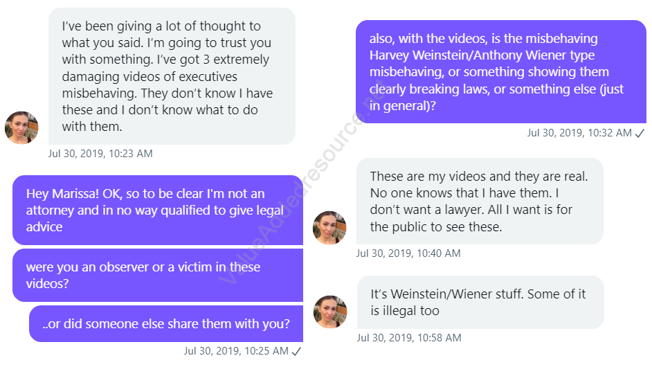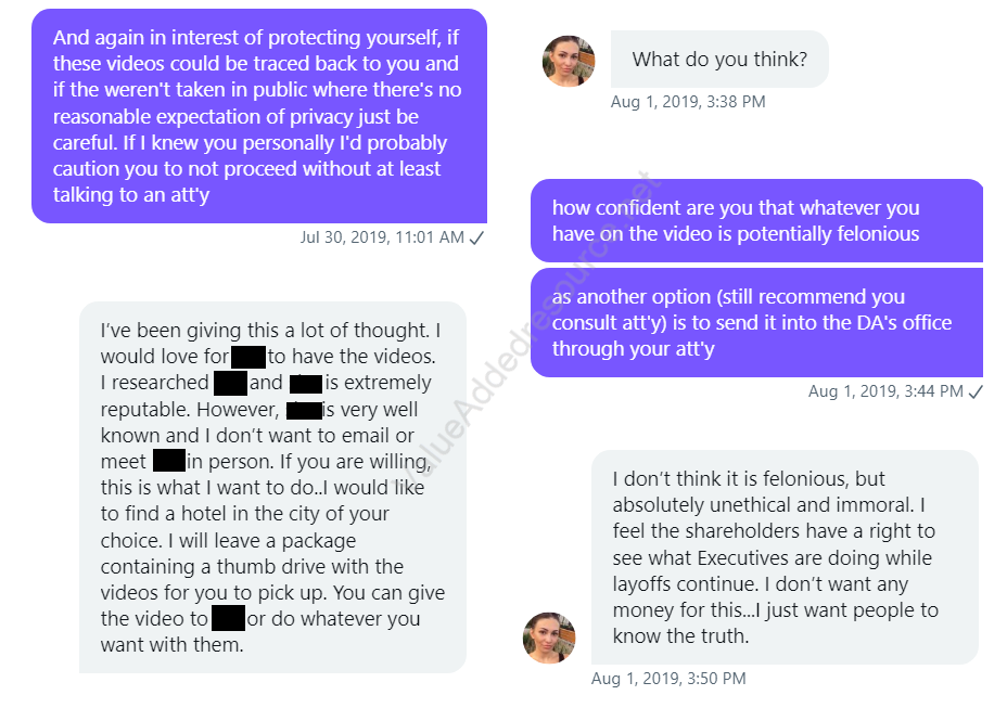The escalation continued until on August 1st, 2019, Wenig (Executive 1) exchanged texts with Wymer (Executive 2), saying it was time to "take down" Ina Steiner.