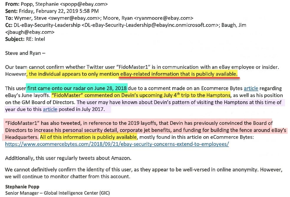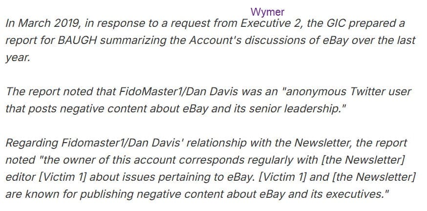Baugh and his security team continued to monitor the account and in March 2019, both Wymer and Chief Legal Officer Marie Oh Huber separately requested a deeper investigation of FidoMaster/unsuckEBAY, looking to identify the person behind the account.
