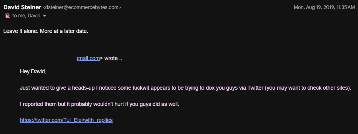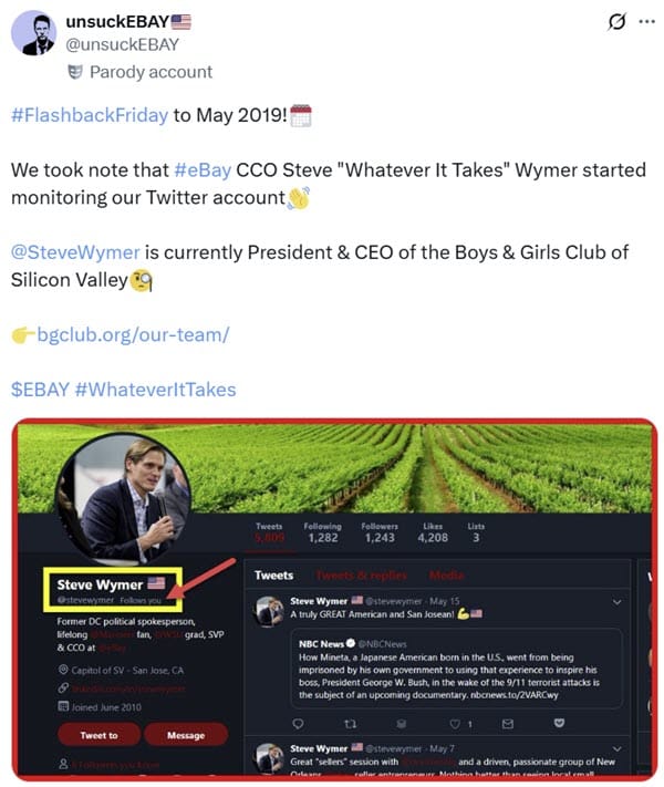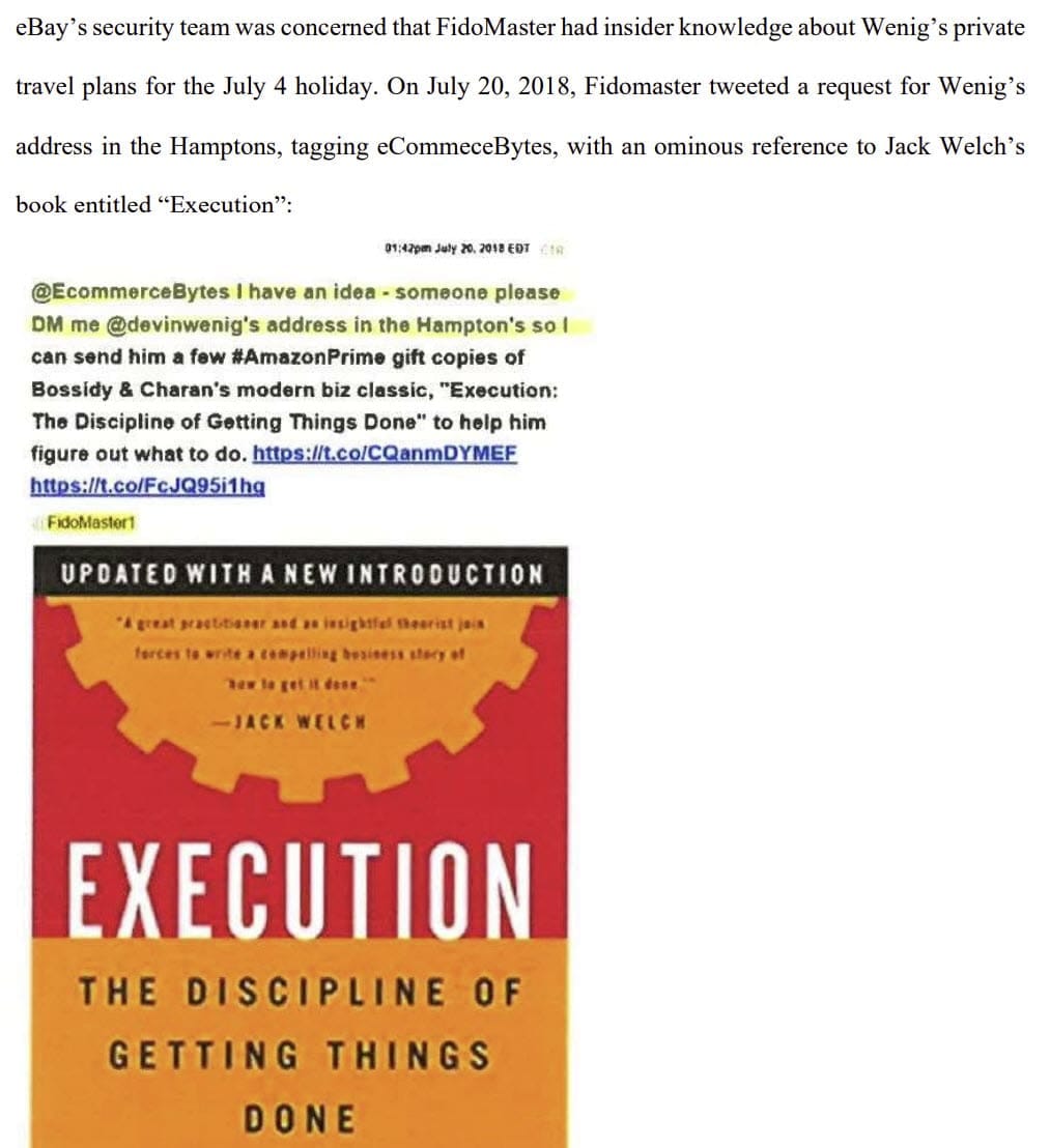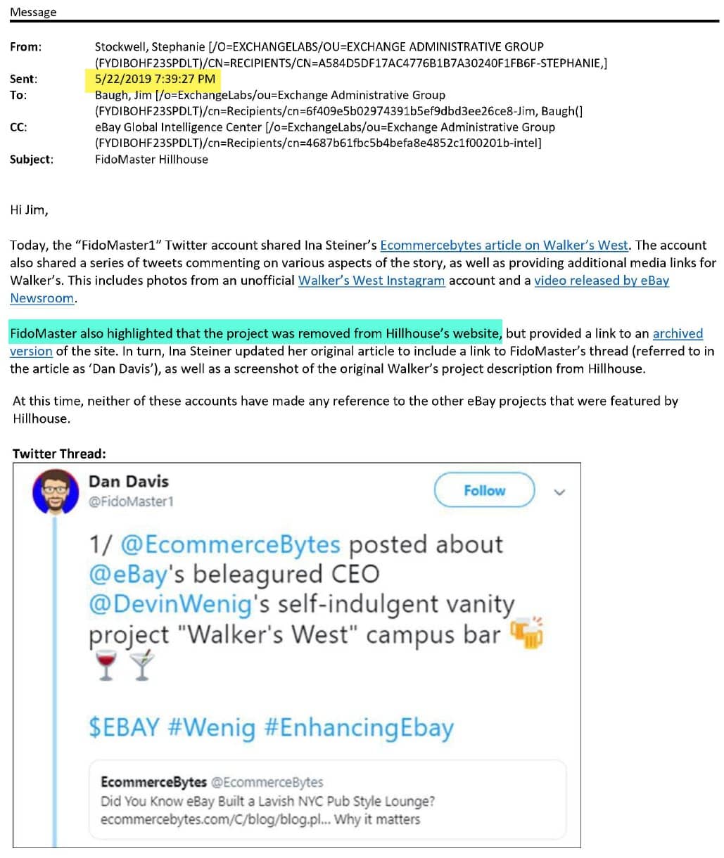 UnsuckEBAY/FidoMaster's amplification of the story on Twitter, and criticism of what he called Wenig's "self-indulgent vanity project" caught eBay's attention, as shown by an email from Global Intelligence Manager Stephanie Stockwell to Jim Baugh dated May 22, 2019.