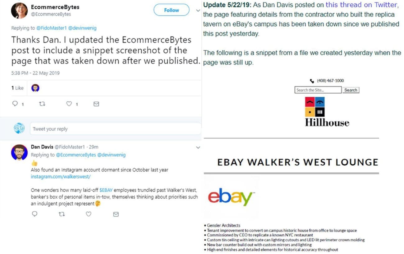 The email went on to show the full tweet thread, including EcommerceBytes responding to thank Dan Davis/FidoMaster/unsuckEBAY for flagging that the details about Walker's West had been removed from the contractor's website, resulting in an update to the EcommerceBytes article dated May 22, 2019.