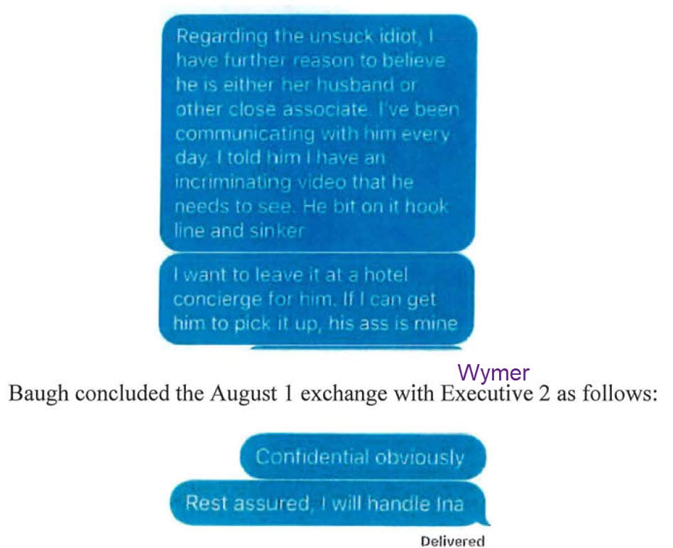 Wymer and Baugh's August 1 2019 conversation continued by text, with Baugh saying "Regarding the unsuck idiot...I've been communicating with him every day. I told him I have an incriminating video that he needs to see. He bit on it hook line and sinker. I want to leave it at a hotel concierge for him. If I can get him to pick it up, his ass is mine...confidential obviously. Rest assured I will handle Ina."