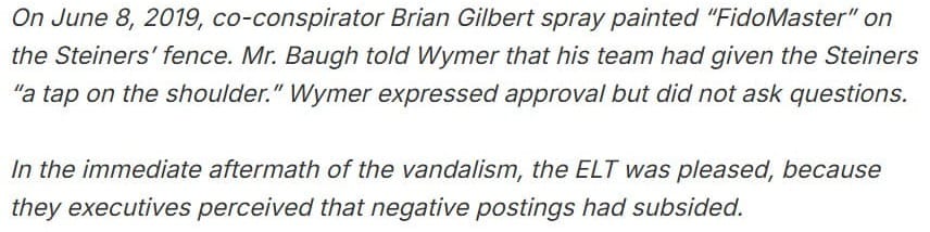 Days later, on June 8, Sr Manager Special Operations Brian Gilbert traveled from California to Massachusetts to engage in an act of vandalism clearly intended as a warning - tagging "Fidomaster" on the Steiners' fence.