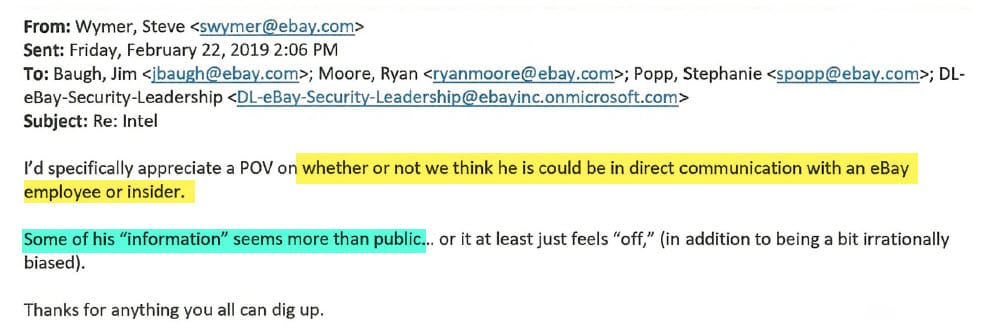 Wymer responded, adding he would "specifically appreciate a POV on whether or not we think he could be in direct communication with an eBay employee or insider" and that "some of his 'information' seems more than public."