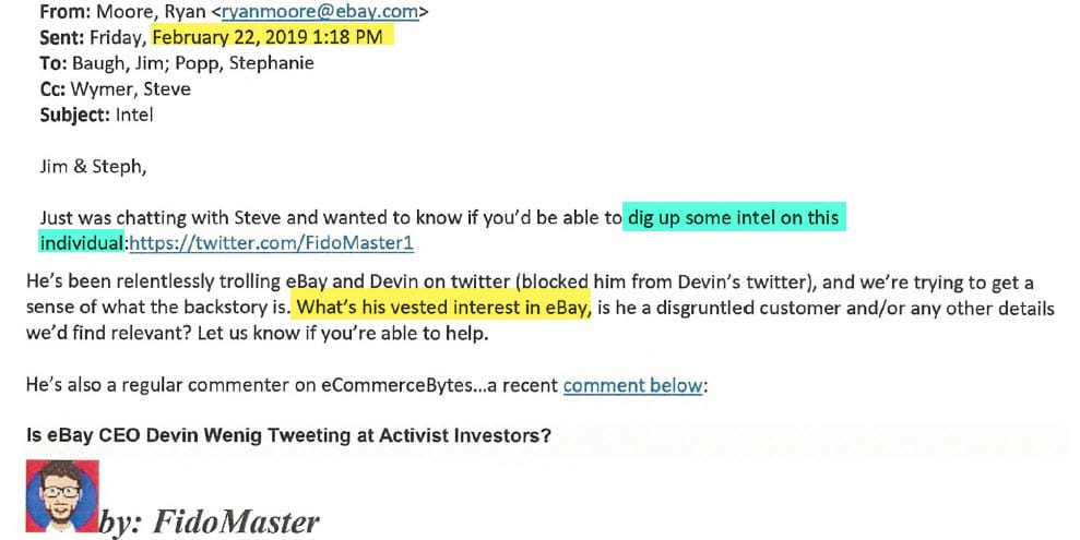 That comment prompted eBay PR director Ryan Moore to email Baugh and Sr Manager Global Intelligence Stephanie Popp, with Wymer cc'ed, requesting for the security team to "dig up some intel" on Fidomaster/unsuckEBAY.
