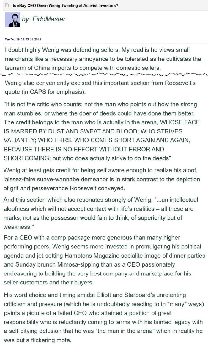 In February 2019, EcommerceBytes published an article about Wenig cryptically tweeting an excerpt from Theodore Roosevelt's "Citizenship in a Republic" speech - more commonly referred to as The Man in the Arena.