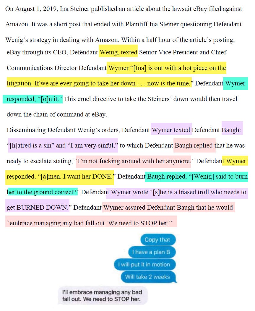 Text messages between Wenig and Wymer during these months showed increasingly amped up reactions to EcommerceBytes' coverage, including a message from Wenig directing Wymer to "take her [Ina Steiner] down" on May 31, 2019.