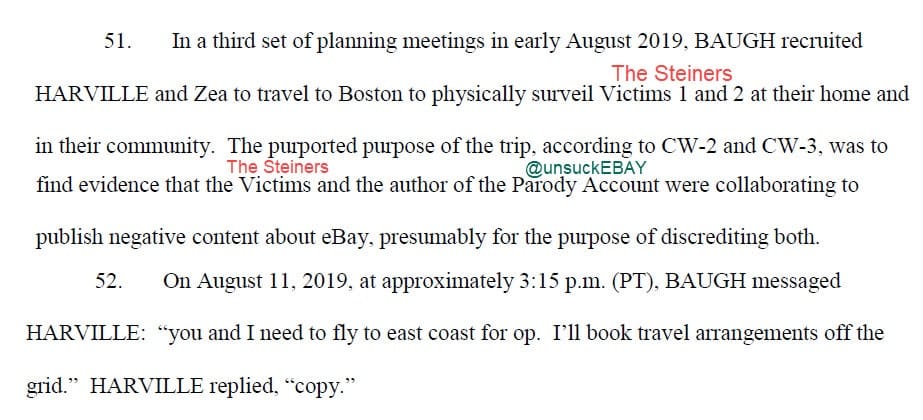 In the wake of those texts and emails, Baugh deployed a "White Knight Strategy" whereby he and his team would anonymously unleash a barrage of bizarre deliveries, send threatening messages and engage in both online and in person stalking with the goal of then being able to come in officially as eBay to offer to "assist" the Steiners in hopes of creating goodwill and trust.
