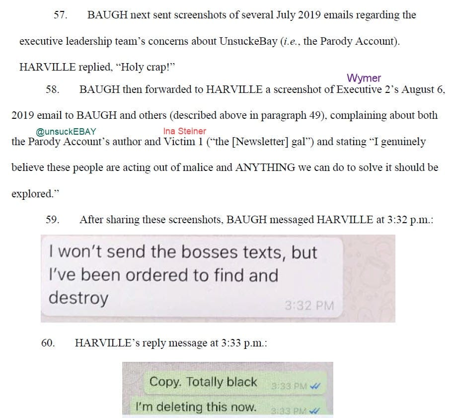 Shortly after that text exchange, Wenig expressed his desire to see the unsuckEBAY Twitter account shut down and assigned the task to Baugh, with Wymer and Oh Huber copied on an email dated August 6, 2019.