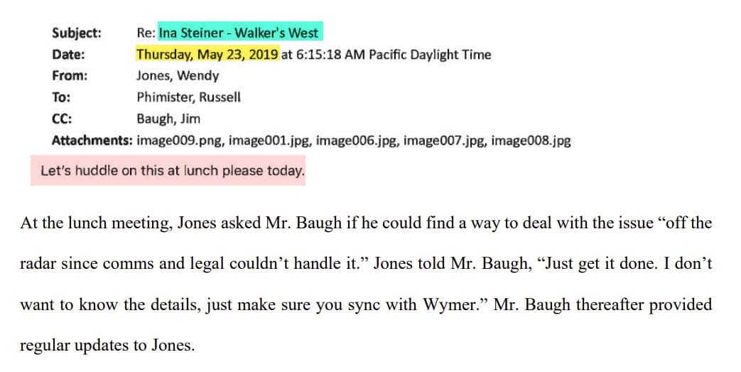 The executive leadership team was so concerned about the optics of the story, Jones requested to "huddle" about the matter over lunch, where Baugh says she told him to deal with the issue "off the radar."