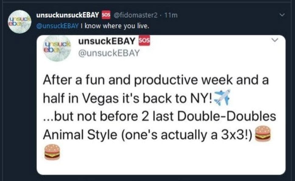 When their plan failed to identify Fidomaster/unsuckEBAY, the account controlled by Baugh and his team tweeted a veiled threat, saying they know where he lives.