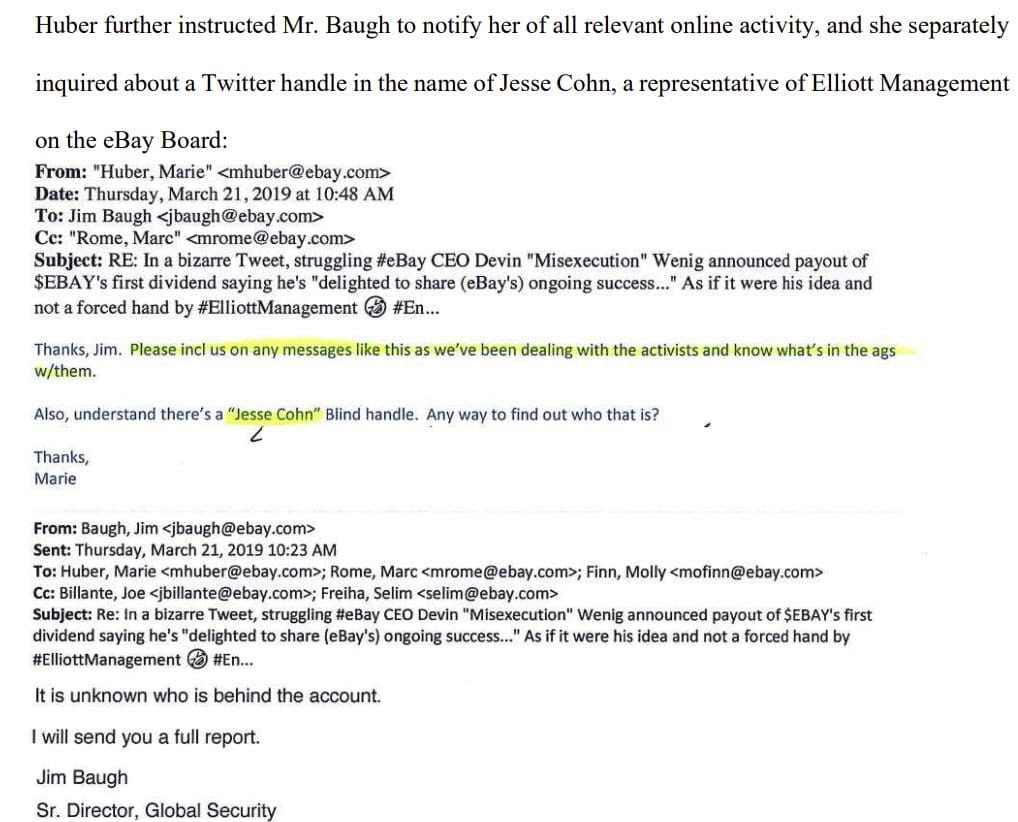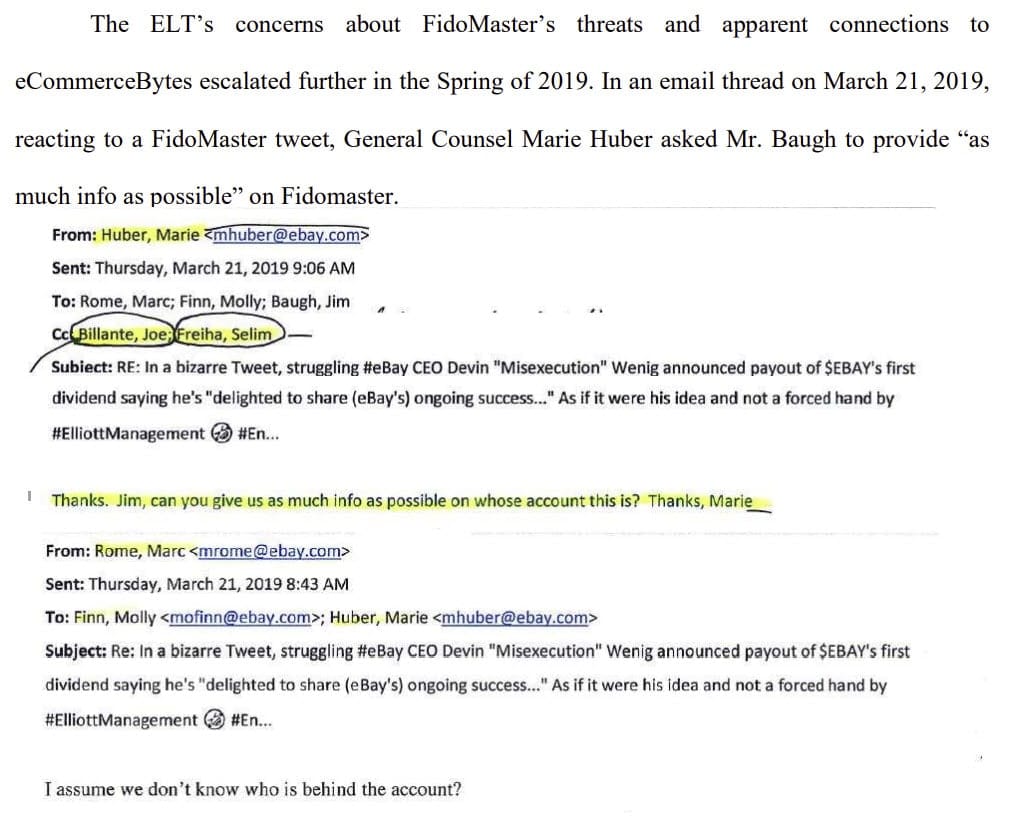 Oh Huber included then VP Deputy General Counsel Corporate Governance Marc Rome, Chief Compliance Officer Molly Finn, VP Markets Selim Freiha and VP Investor Relations Joe Billante, asking Baugh to give everyone copied as much info as possible about who was behind the Fidomaster/unsuckEBAY account.