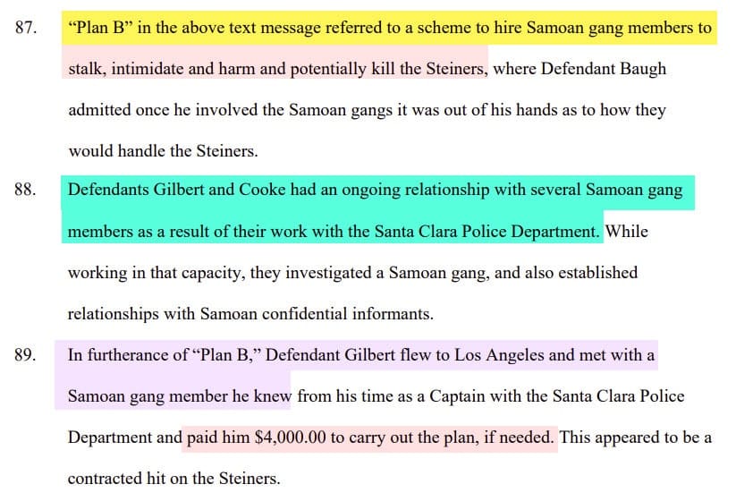 According to the Steiners' civil suit, that "plan B" allegedly involved hiring Samoan gang members Gilbert and Security Manager Philip Cooke knew from their previous careers in the Santa Clara Police Department to stalk, intimidate, harm and potentially kill the Steiners.
