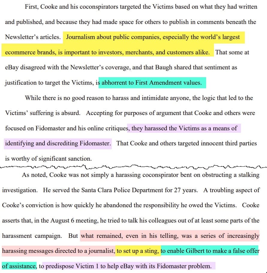 Notably, Kosto explicitly called out the White Knight Strategy to out Fidomaster/ unsuckEBAY as particularly egregious, abhorrent to First Amendment values and cause for significant sanction in his sentencing memorandum in the criminal case against Security Manager Philip Cooke.