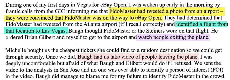 Baugh became paranoid about unsuckEBAY possibly attending the annual seller conference, eBay Open, in late July 2019, dispatching Zea and Gilbert to surveil arriving passengers at the Las Vegas airport in hopes of catching him.