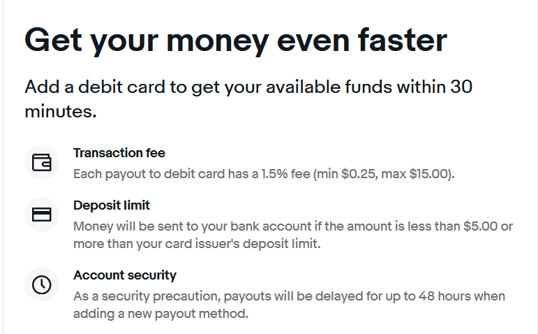 Sellers received the notice in an email, advising as of July 1, the fee for Express Payouts to a debit card will be changing for the previous 1.5% to a flat rate $2.