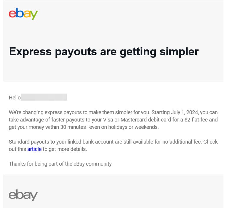 It's not clear what exactly eBay believes is "simpler" about this change, as Express Payouts to debit card have always provided access to funds within 30 minutes even on weekends and holidays since the feature was introduced in June 2022.