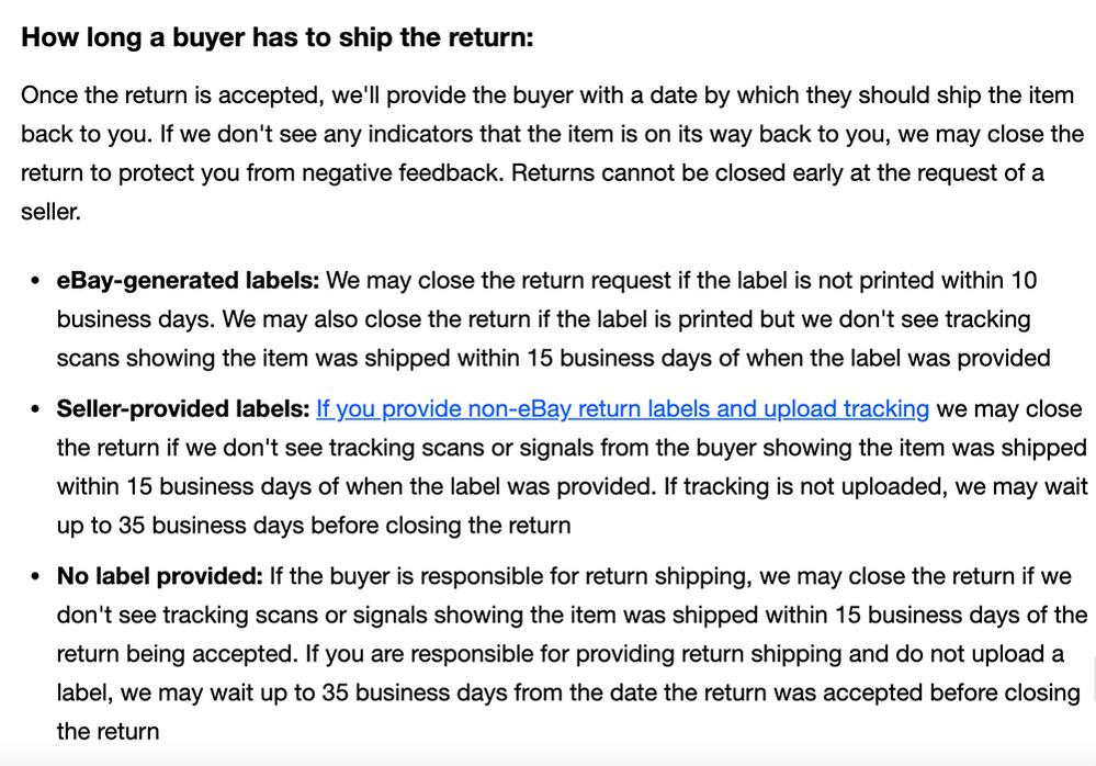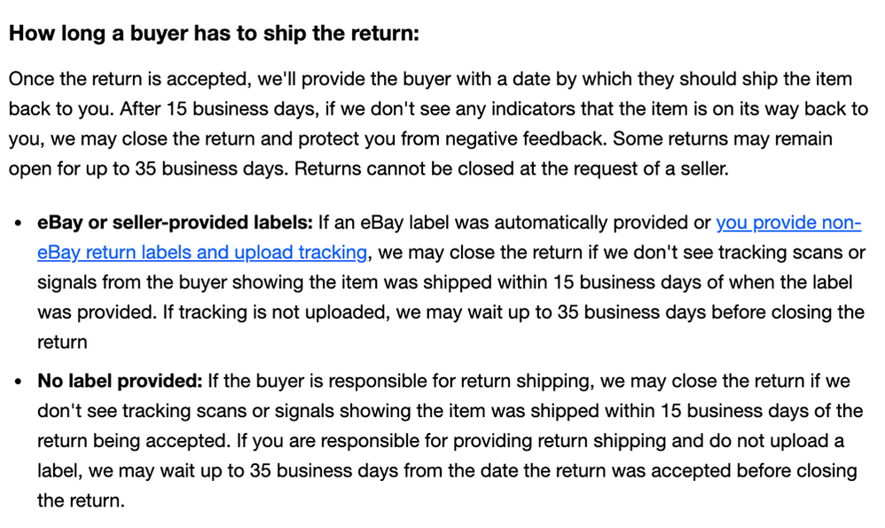 When buyers are sent an eBay-generated return label, the return is closed if the label is not printed within 10 business days. If the buyer prints the label, we allow the return to remain open an additional 5 business days to ensure shipping scans are captured. When buyers are not sent an eBay-generated return label, we wait up to 35 business days before closing the return.