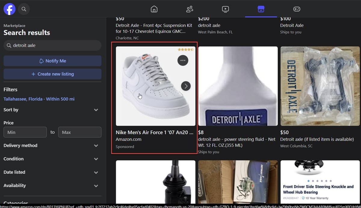 Facebook already inserts sponsored ads into Marketplace search results - like this one for Amazon: