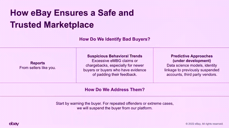 Instead, Ian basically gave a Seller School 101 walk through of how returns work on eBay and seller protections that have been in place for years. Once interesting note is that eBay is apparently working on predictive approaches to flag potentially bad buyers - including gathering information from third party vendors to identify users who may have a history of bad behavior on other platforms.