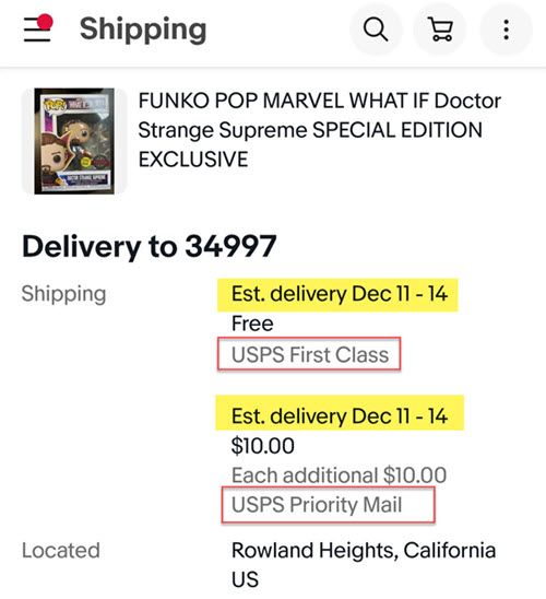 Interestingly, eBay is showing the same estimated delivery for both USPS First Class and USPS Priority Mail services.