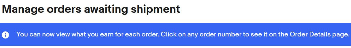 Sellers report seeing a banner on the Orders page in Seller Hub that says "You can now view what you earn for each order. Click on any order number to see it on the Order Details page."
