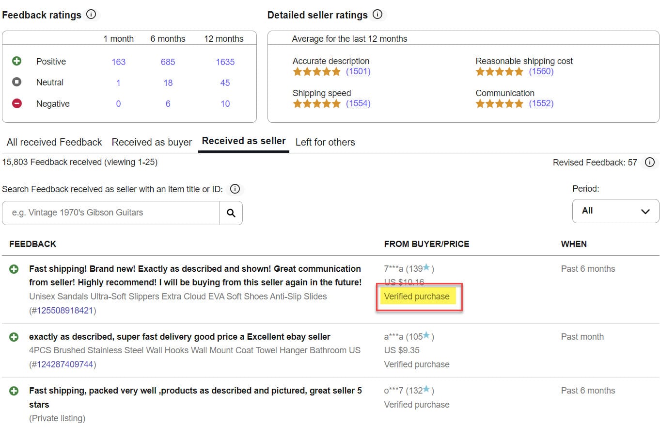 Earlier this month we introduced a change to the eBay mobile app displaying the term “verified purchase” on the feedback page. We are implementing this change on the desktop in the next few weeks.