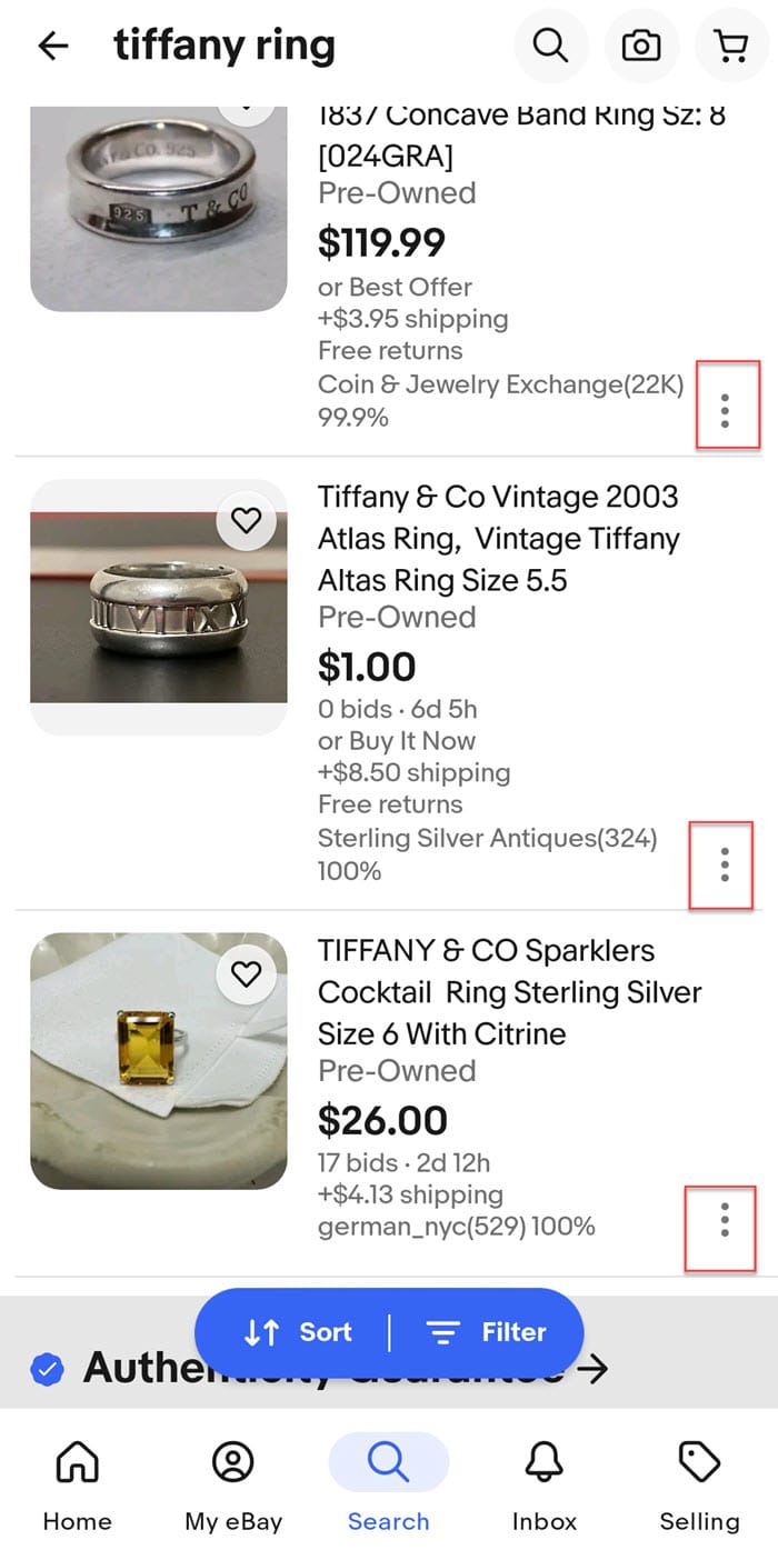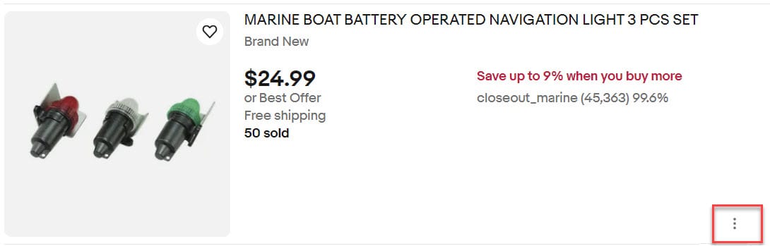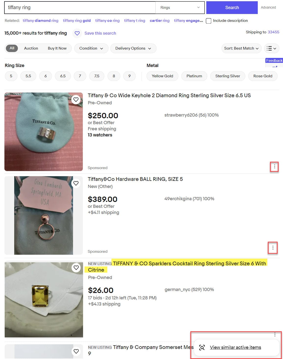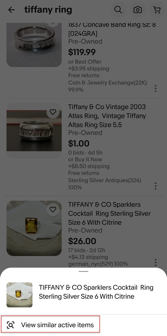 Users have noticed the addition of three vertical dots at the bottom right of results in search and clicking those dots pops up an option to "view similar active items."