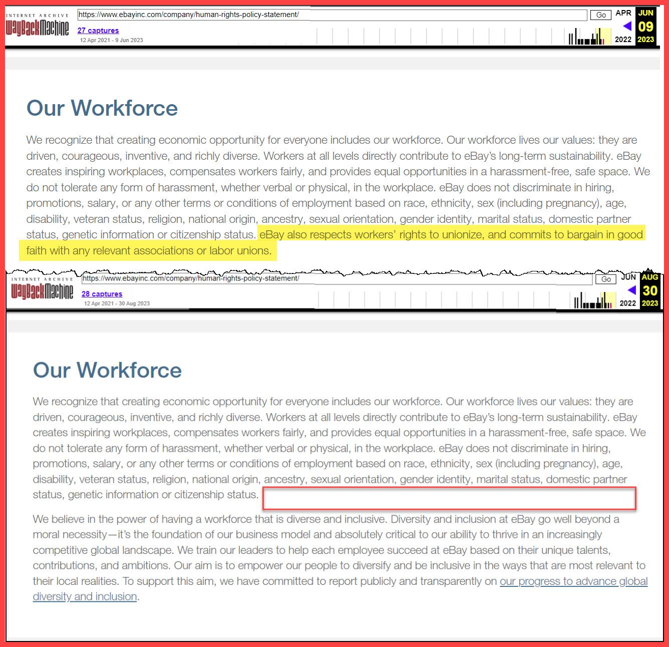 eBay quietly removed language that had been included in their Human Rights Policy since at least April 2021 which explicitly supported workers' rights to organize.