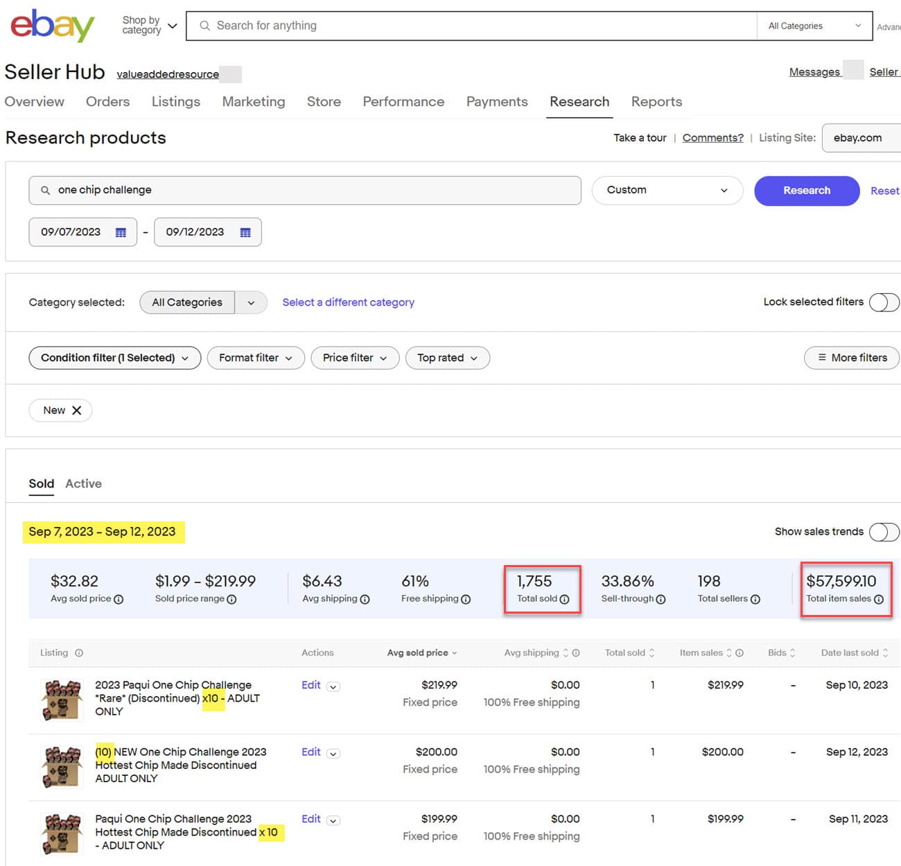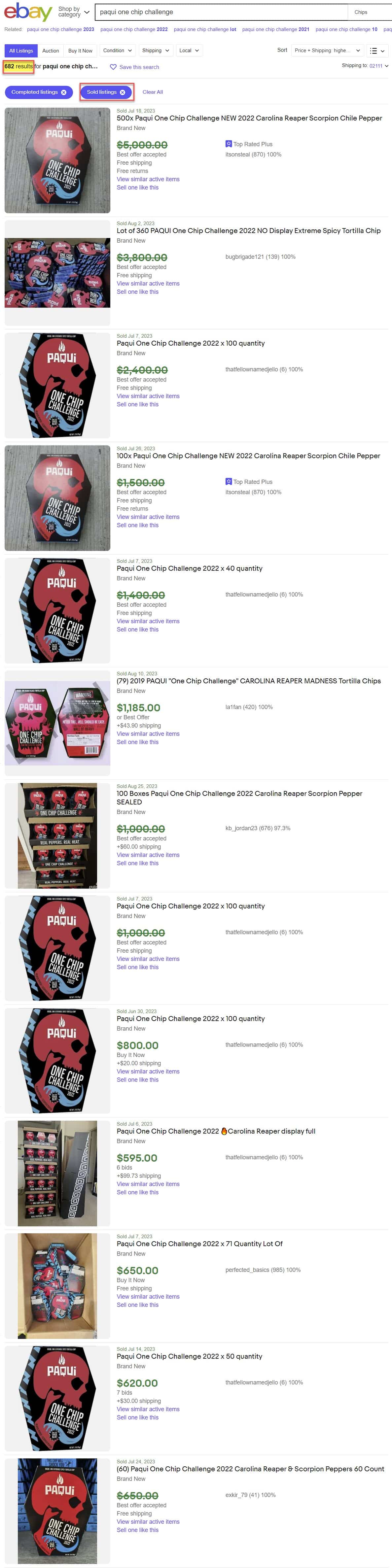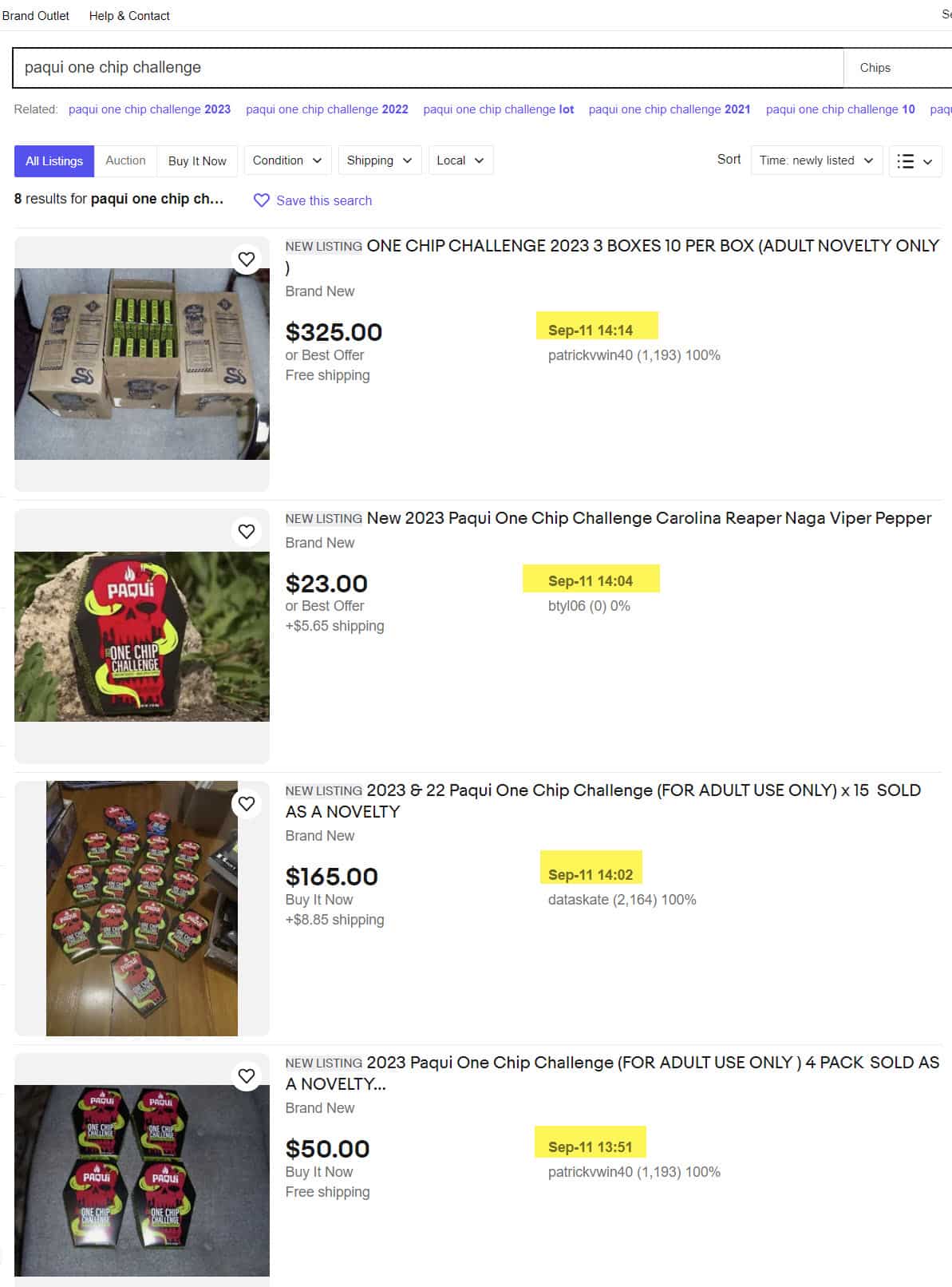 Paqui One Chip Challenge continues on eBay with over $57,000 worth sold since being recalled on 9-7-23 due to safety concerns.