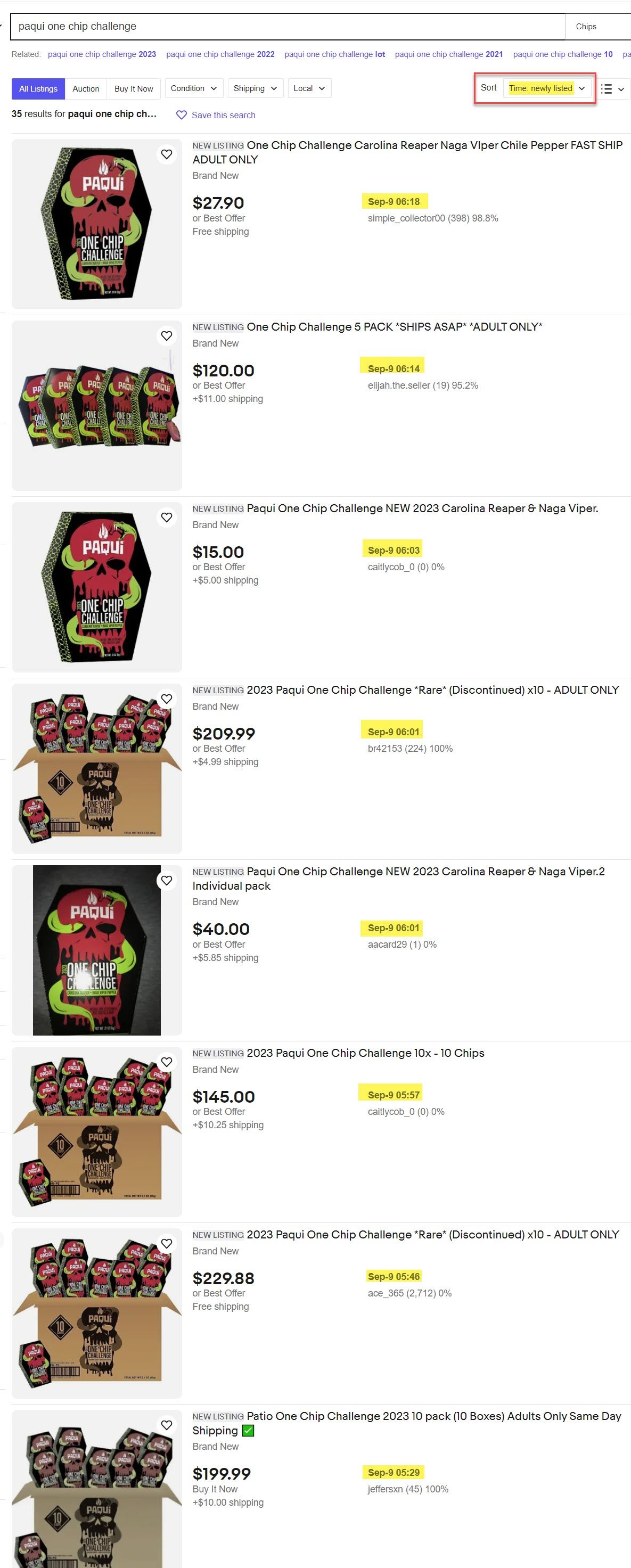 Sorting search by "time: newly listed" shows the ongoing problem that eBay is not proactively taking action to stop.