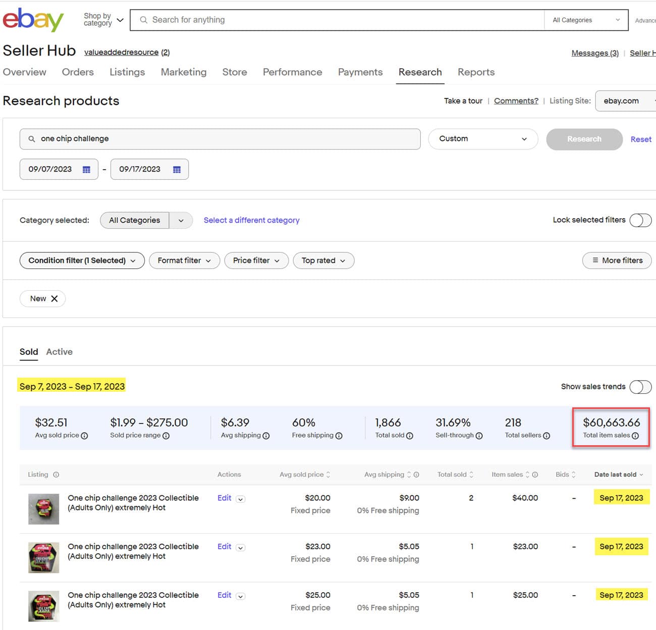 Sales on Paqui One Chip Challenge on eBay have slowed but definitely still not stopped as new active listings continue to pop up and over $60,000 worth of sales have been made since the product was recalled from stores on 9-7-23.