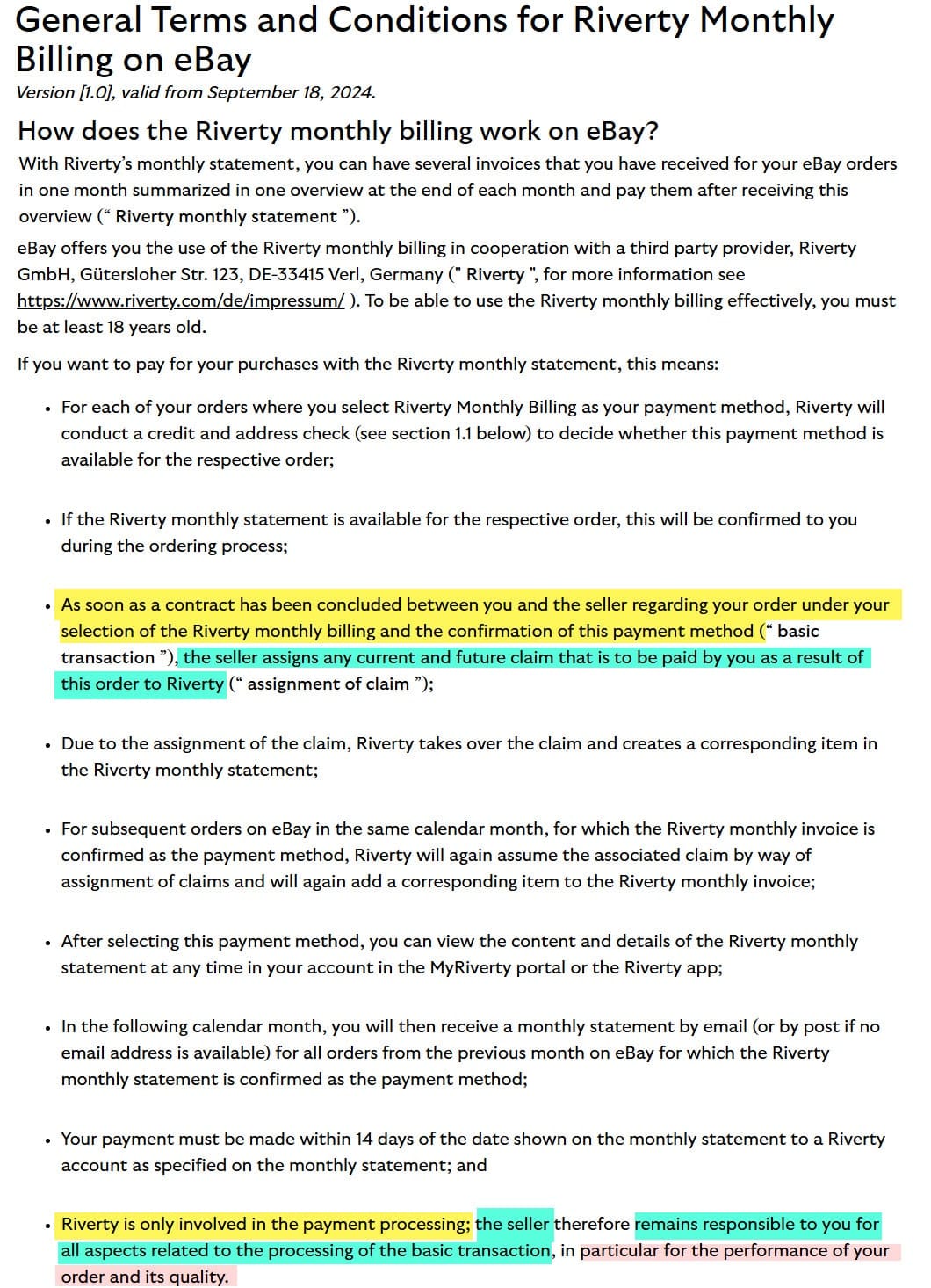 So with the usual caveats that I am not a lawyer or financial advisor, nor a native German speaker, it appears that eBay's press release is in fact correct - nothing changes for sellers when buyers use Riverty monthly invoicing.