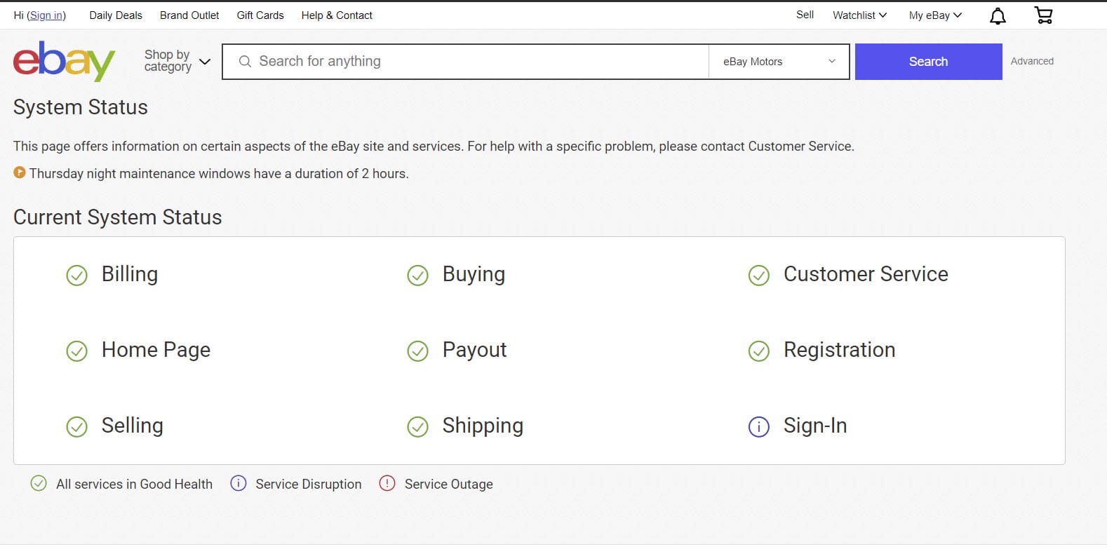 Unsurprisingly, the eBay system status page shows no disruption to Home Page, but does show a disruption in Sign-In.