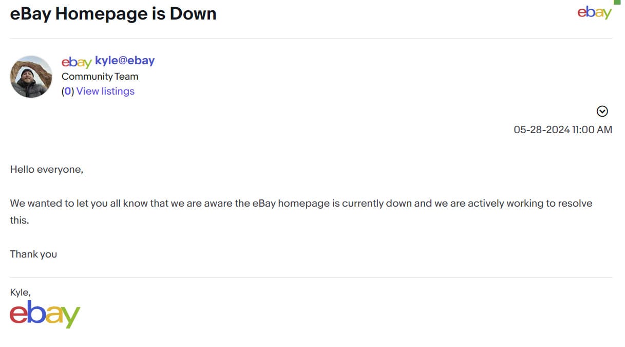 However, eBay community staff have already proactively posted in the forums to inform users eBay is aware of the outage and working on a fix.