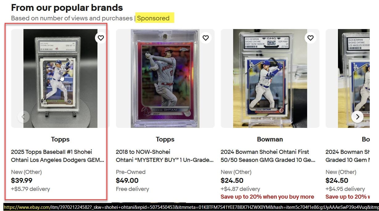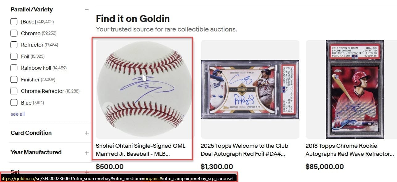 We can clearly see that the Find It On Goldin carousel display shows no signs of being a Sponsored or Promoted ad in any way - in fact, the URLs even explicitly tag these links as "organic."