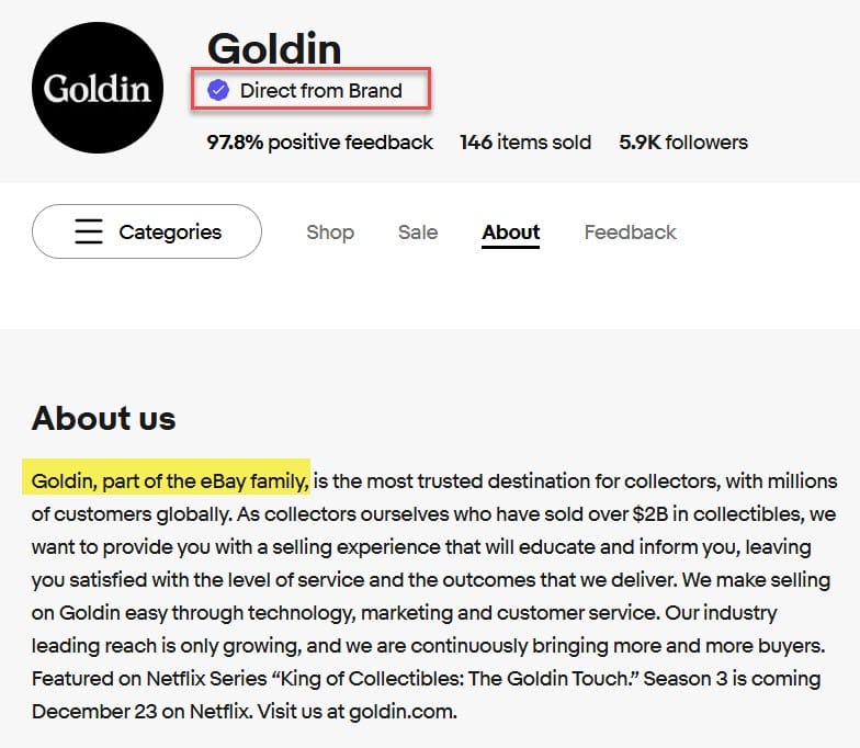 eBay appears to have learned at least one lesson from that debacle, with the official Goldin eBay account at least acknowledging it is "part of the eBay family", but they're still dishonestly self-preferencing with the "Direct from Brand" badging on store and listing pages, despite the fact that Goldin is not the manufacturer or brand rights owner for the trading cards and memorabilia they sell.