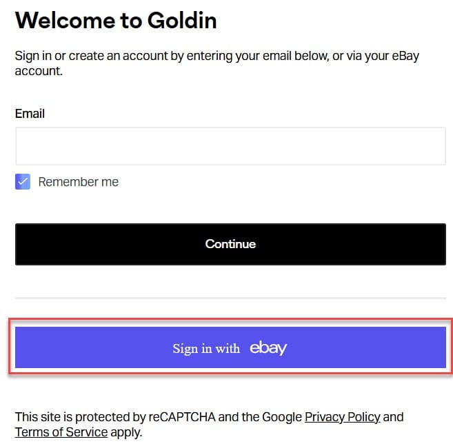 When logging in or creating an account on Goldin, users will now see a button that says "sign in with eBay." The button will lead the user to an eBay sign on screen.